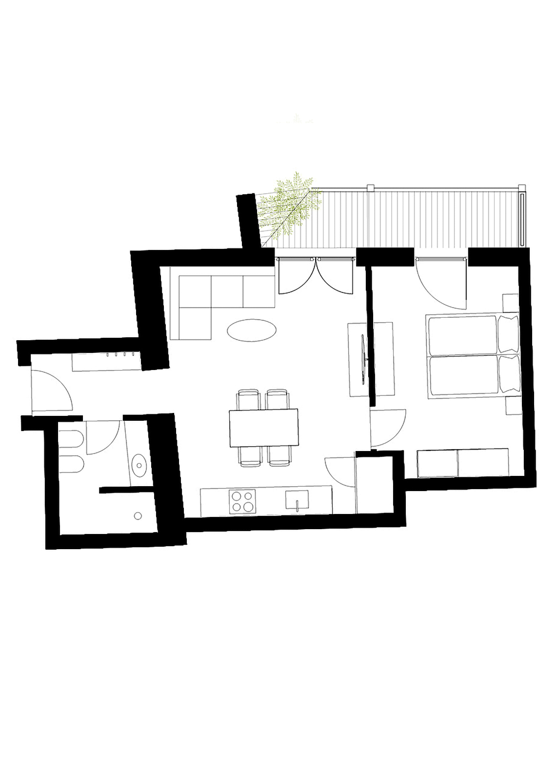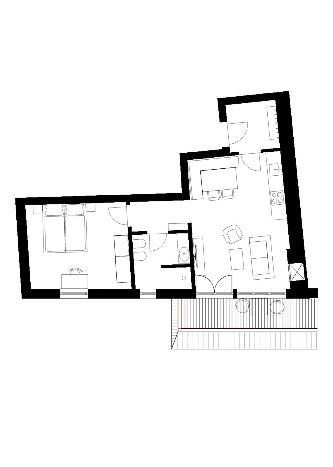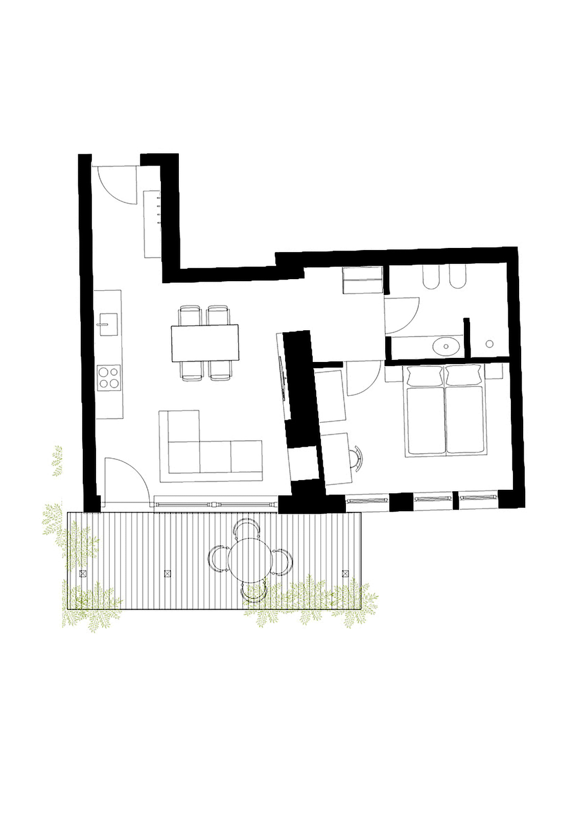- Zona giorno con angolo cottura completamente attrezzato – piano cottura a induzione, forno, lavastoviglie, frigorifero con congelatore, macchina da caffè, stoviglie, posate, bicchieri